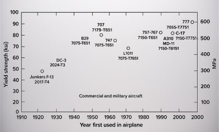 The yield stress of AA7055-T7751 can reach 620 MPa with high fracture toughness and corrosion resistance. The application of this alloy in components in the Boeing 777 reduced the airplane weight by 635 kg.