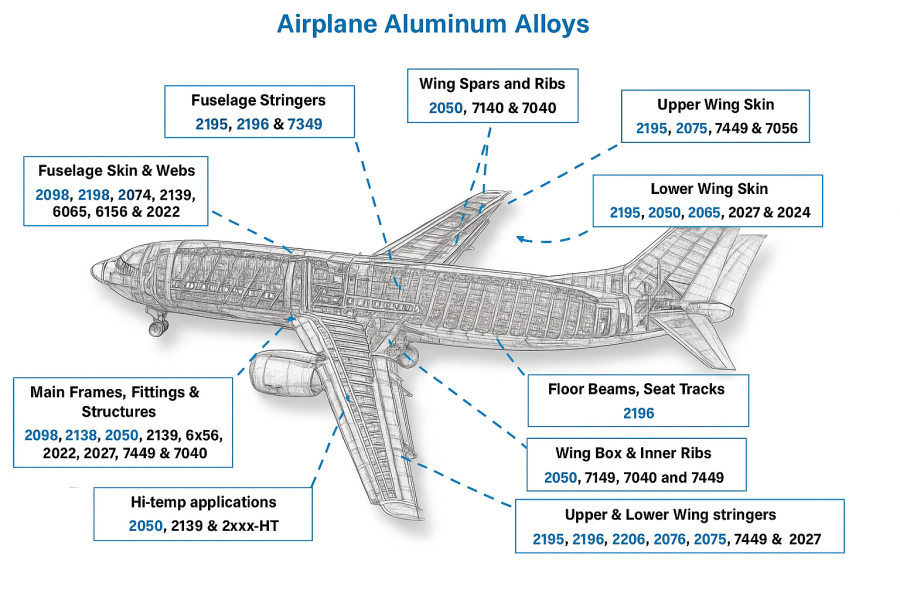 Another high performance alloy AA7050 is used in fuselage frames and bulkheads as a form of thick plate (the best thickness ranges from 76 mm to 152 mm), and the sheet materials are used to fabricate wing skins.