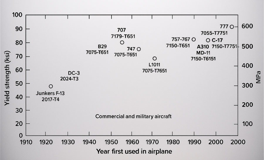 The evolution of aluminum alloys in aerospace engineering reflects a continuous optimization of the intrinsic trade-off between strength, corrosion and damage tolerance. Early designs, based on static tensile properties and elastic modulus, yielded to a modern paradigm rooted in Fracture Mechanics and Durability and Damage Tolerance (DaDT) principles.