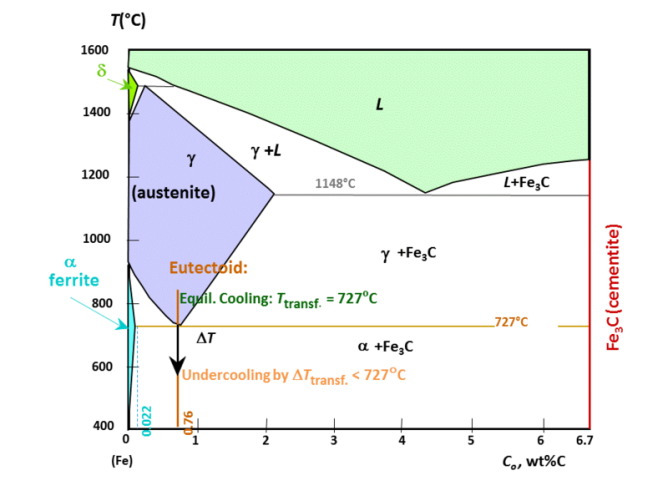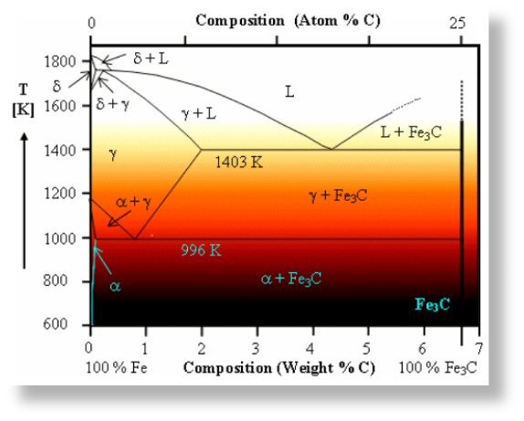 Composition and metallurgy of carbon steels can be best introduced via using the ‘Iron Carbon Diagram’. The diagram shown below is based on the transformation that occurs as a result of slow heating. Slow cooling will reduce the transformation temperatures; for example fast heating and cooling rates ocurring in welding have a significant influence on these temperatures, making the accurate prediction of weld metallurgy using this equilibrium diagram challenging.