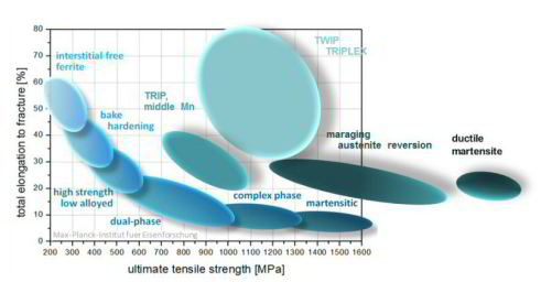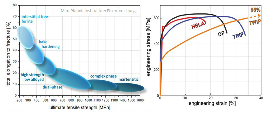 Inverse strength-ductility relationship for different types of steels. The introduction of special deformation mechanisms which active additional strain hardening capacity at high strains such as the TRIP or TWIP effects can lead to novel metallic materia