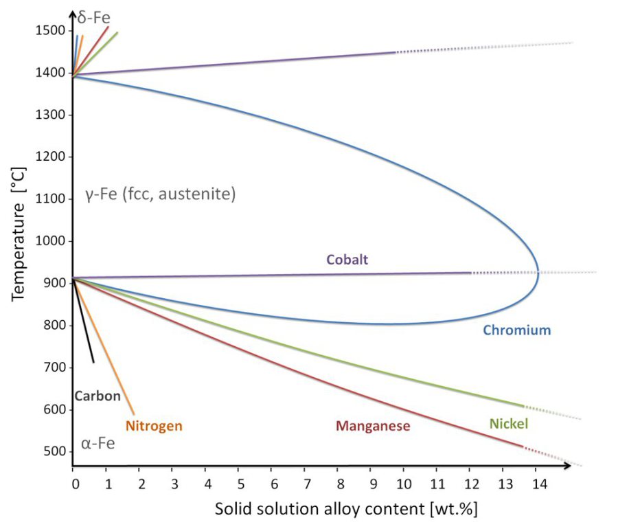 Fe and Mn as principal austenite formers providing a wide fcc (γ) phase field,